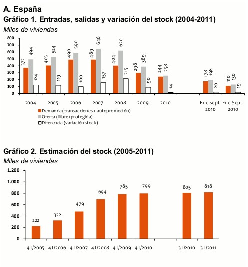 La parálisis del sector de la construcción, la caída de las ventas y de la concesión de hipotecas hace cada vez más complicado que el stock de viviendas se reduzca. Según un informe de Catalunya Caixa, el stock de viviendas nuevas pendientes de venta se situó en septiembre de 2011 en 818.000 viviendas, es decir, que creció un 2% respecto al cierre de 2010. Este número de inmuebles equivale al 3,2% del parque de viviendas de España.