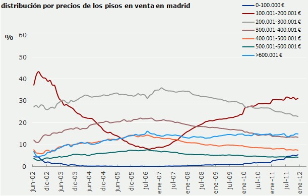 En Madrid, según el portal inmobiliario líder en España, este tipo de viviendas han crecido un 31%, esto supone dos puntos porcentuales más que en 2010, regresando así a niveles de 2003. Se da la paradoja de que durante los años del boom apenas el 10% de las viviendas costaban menos de 200.000 euros en Madrid capital.