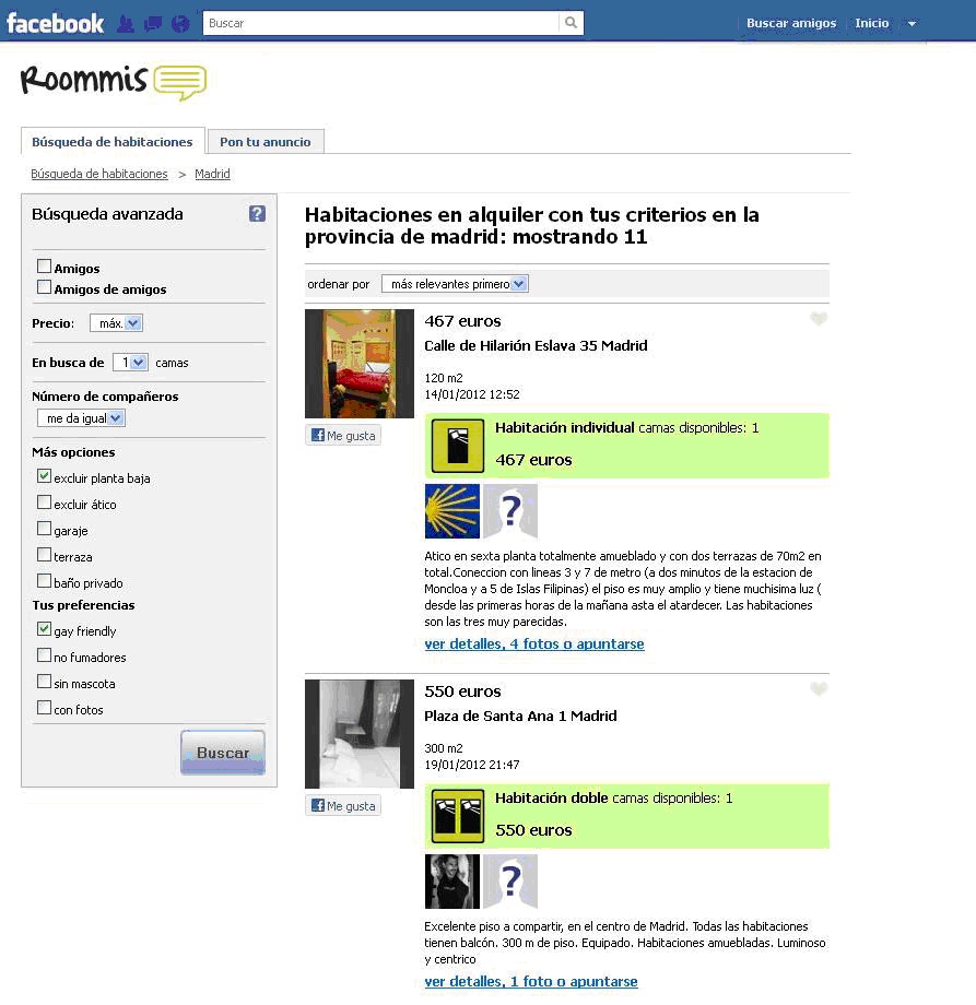 Observando este potencial y la implantación de las redes sociales en nuestra sociedad, el portal inmobiliario Idealista.com ha lanzado Roommis, una aplicación basada en Facebook especialmente diseñada para buscar y ofertar casa compartida. Roommis aprovecha todo el potencial y la viralidad de la red social más popular (más de 800 millones de usuarios) para facilitar la rápida búsqueda y asegurar la afinidad con los compañeros de piso compartido.