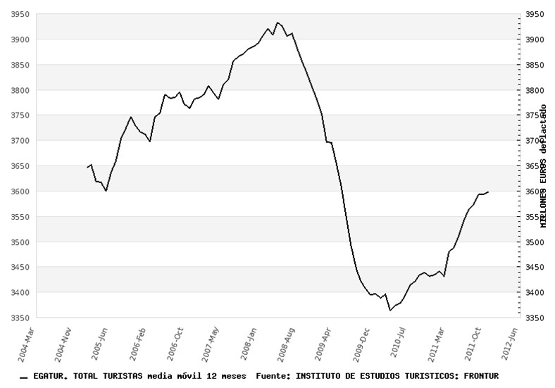 Si revisamos los datos nos encontramos, en primer lugar, con unos ingresos por turismo extranjero que crecieron en diciembre a una tasa del 5,5%, superior a la de noviembre. Sin embargo, los ingresos han sido inferiores (aun sin deflactar) a los de 2006, 2007 y 2008, al contrario de lo que pasó entre abril y agosto de 2011, en que mes tras mes se batieron records de ingresos. Si deflactamos el dato nos encontramos aún muy lejos de máximos, aunque la recuperación desde los mínimos de 2010 es evidente, tal y como se puede observar en el siguiente gráfico.