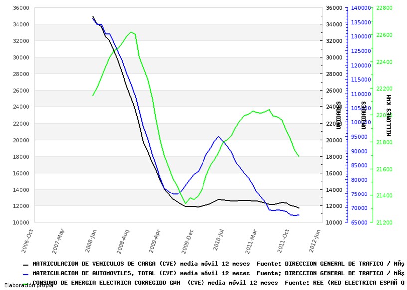 - El consumo de energía eléctrica, que ajustado de temperatura y calendario, aumentó por primera vez en cuatro meses (+1,4% respecto al cuarto trimestre de 2011). En el gráfico suavizado no se aprecia ese aumento.
