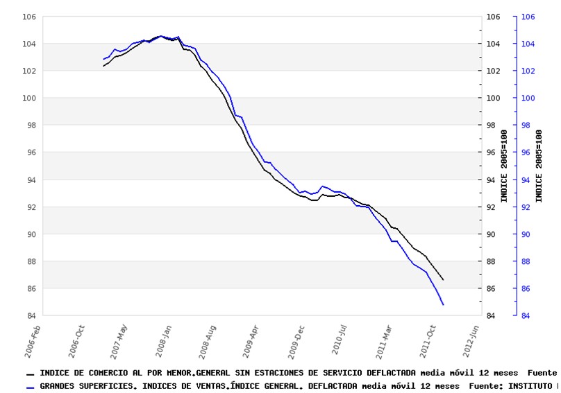 - El Índice de Grandes Superficies siguió la misma tónica pero, como viene siendo habitual, mostrando aún más debilidad que el índice general (-8,4%). Sorprende la debilidad y escasos recursos que están mostrando estas grandes empresas, que están perdiendo la batalla, sobre todo, con las grandes cadenas. En el gráfico se muestran ambos índices.