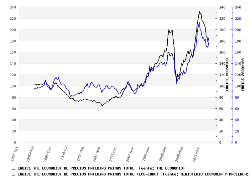 Después de ocho meses de bajadas continuadas en los precios, el índice The Economist de materias primas registró una fuerte subida en enero. Nuevas inyecciones de liquidez en la economía no harán sino acentuar este efecto, haciendo que, muy probablemente, se repita de forma rápida el ciclo visto en 2007-2008 y en 2010-2011, con una fuerte subida de precios y un posterior parón de la economía con nuevas caídas de precios.