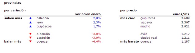 El ranking de las provincias más caras se mantiene sin novedades, encabezado por las provincias vascas de Guipúzcoa y Vizcaya, con 3.609 euros/m2 y 3.367euros/m2 respectivamente. Tras ellas se sitúan Madrid (2.921 euros/m2) y Álava (2.579 euros/m2). Barcelona queda relegada al quinto puesto (2.562 euros/m2).
