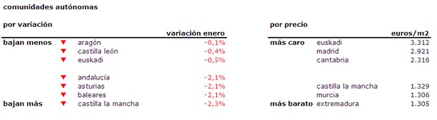 Los mayores decrementos se han producido en Castilla la Mancha, donde los precios han bajado un 2,3%; mientras que en Baleares, Asturias y Andalucía el precio descendió un 2,1% en los tres casos. En el lado opuesto de la tabla, con los menores decrementos, se encuentra Aragón, con una bajada del 0,1%. Por detrás están Castilla y León (0,4%) y País Vasco (0,5%).