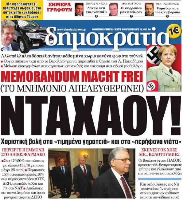 Hasta tal punto esto es así que políticos, medios de comunicación y amplias capas de la sociedad griega no dudan en tildar de nazis a los alemanes por tratar de imponer sus criterios económicos y presupuestarios. Así, por ejemplo, el diario heleno Dimokratia News incorporaba en su cabecera un fotomontaje en el que la canciller germana, Angela Merkel, aparecía vestida con un uniforme propio del ejército de Hitler, con esvástica incluida. Y ello, para denunciar las condiciones de ajuste solicitadas por la troika para tratar de reconducir el caos económico del país.