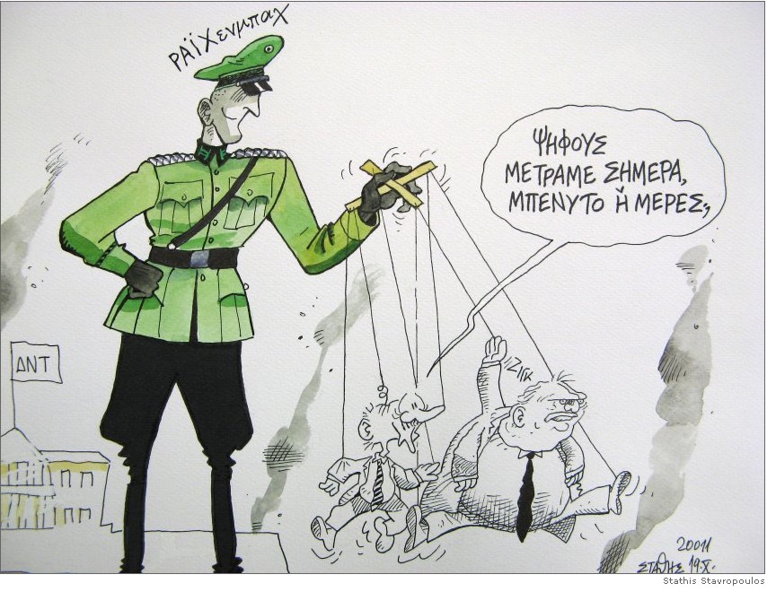 Stathis Stavropoulos está también muy versado en símbolos del Tercer Reich. Stavropoulos es uno de los caricaturistas más cotizados de la prensa griega, y desde el inicio de la crisis suele centrar su arte en los alemanes. Así, sus dibujos, visualizados por más de 100.000 lectores cada semana, suelen incorporar a Merkel, Sarkozy y algunos representantes de la troika vestidos con uniformes de la Segunda Guerra Mundial, ironizando así con la ocupación nazi del país.