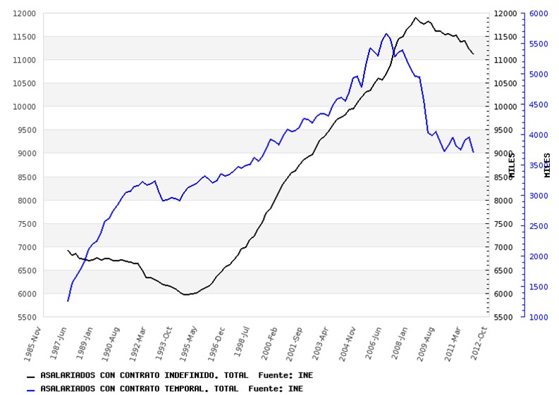La brusca recaída de la economía española ha acabado con esas esperanzas. Si bien el empleo indefinido se mantuvo estable en 2010, en 2011 la destrucción de éste ha sido impresionante: 389.200. Mientras, el empleo temporal bajó en 95.900 personas.