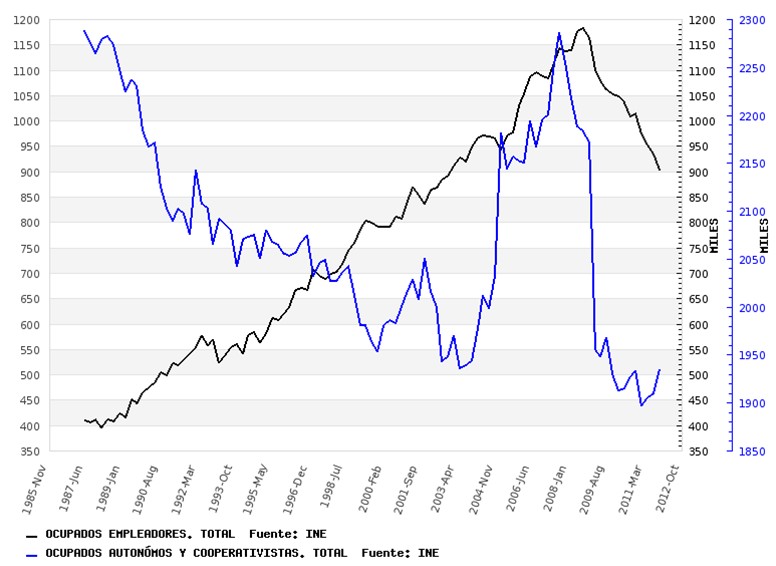 Paralelamente, se ha observado un levísimo repunte en el número de autónomos, lo que significa que seguramente algunos de estos empresarios han seguido con su actividad como autónomos (y con pocos o ningún empleado), aunque también este repunte puede deberse a los parados que están intentando la aventura de emprender ante el nefasto panorama laboral.