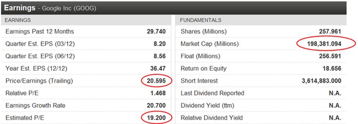 Por ejemplo, Google (GOOG). Basta con acudir a los datos que nos ofrece Bloomberg, para saber que la capitalización bursátil de la compañía –el número total de acciones por el precio al que cotiza la acción– ronda los 200.000 millones de dólares. Ya tenemos, pues, el primer dato: la capitalización bursátil de Google duplicaría a la de Facebook.