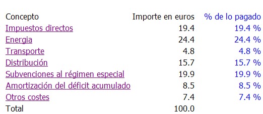 - Los impuestos directos (IVA e impuesto sobre la electrividad) ascienden al 19,4% pagado.
