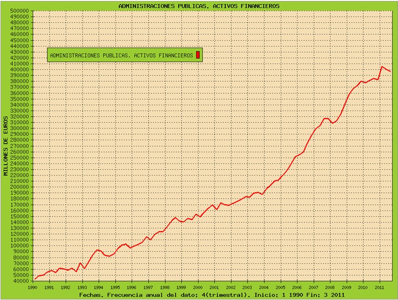 No obstante, el hecho de que se haya emitido más deuda no tiene por qué implicar que se haya gastado. Por ello, hay que recurrir a comprobar cuál ha sido la evolución de los activos financieros de las administraciones. Entre septiembre de 2010 y septiembre de 2011 estos activos financieros aumentaron desde 385.000 millones hasta 396.700 millones, es decir, 11.700 millones más. Mientras, entre septiembre de 2009 y septiembre de 2010 aumentaron desde 372.400 millones hasta 384.300 millones, es decir 11.900 millones más.