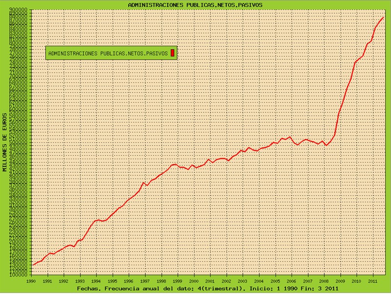 El primer dato importante es la evolución de los pasivos en circulación, que habían aumentado entre enero de 2011 y septiembre de 2011 desde 805.500 millones hasta 877.500 millones, es decir, 72.000 millones. Frente a este dato, entre enero de 2010 y septiembre de 2010 los pasivos en circulación del conjunto de las administraciones aumentaron desde 739.500 millones hasta 796.300 millones, lo que supuso un aumento de 56.800 millones. Es decir, que los pasivos aumentaron en los tres primeros trimestres de 2011 uno 15.200 millones más que en el mismo período de 2010.