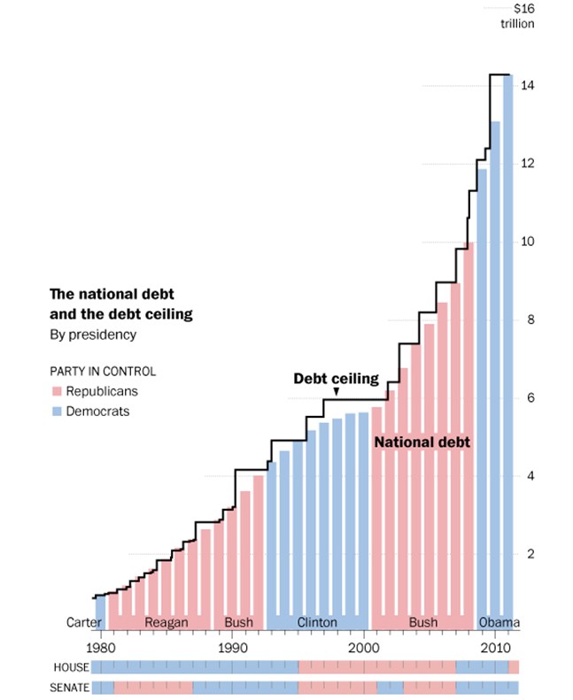 En abril, Obama presumía de haber conseguido "el mayor recorte anual de gasto de la historia" gracias al acuerdo con los republicanos. Sin embargo, el recorte real del acuerdo era 100 veces menor de lo anunciado. Y los problemas continuaron. El Washington Post elaboró el pasado mes de junio un gráfico en el que puede apreciarse claramente el aumento de la deuda pública (National debt), paralelo a los sucesivos aumentos del techo de gasto (Debt ceiling) desde 1980 hasta 2011. En junio de 2011, el techo de deuda ya había rebasado los 14 billones de dólares.