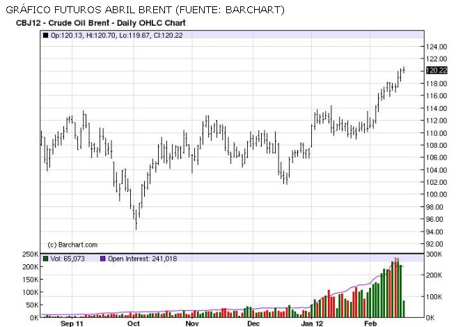 Los gráficos son el reflejo de la vida misma. Los futuros del crudo apuntan al alza con unos volúmenes de compra tremendamente destacados en comparación con estos cuatro años que dura ya la crisis económica. Los indicadores de futuros sobre el Brent hablan de una clara sobrecompra. El precio del petróleo europeo para el mes de abril se coloca en los 120,22 dólares el lunes, dibujando una clarísima escalada desde mediados de diciembre del año pasado.