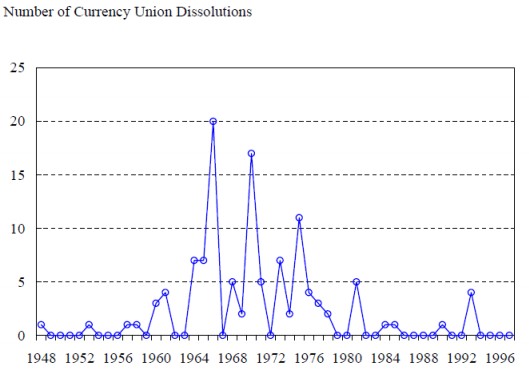 "La ruptura del euro sería un evento histórico, pero no sería la primera ruptura monetaria de la historia". En los últimos 100 años se han producido 69 rupturas monetarias, tales como la del Imperio Austrohúngaro en 1919, India y Pakistán en 1947, Pakistán y Blangladesh en 1971, Checoslovaquia en 1992-93 o la URSS en 1992.