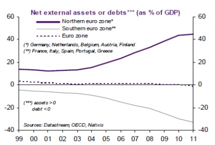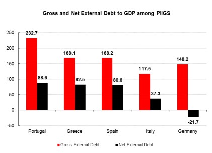 Además, el problema de la periferia europea consiste en que mucha de esa deuda es externa -créditos extranjeros-. La periferia presenta un endeudamiento externo muy superior al registrado durante la crisis de los países asiáticos en 1997, que terminaron suspendiendo pagos y devaluando sus monedas.