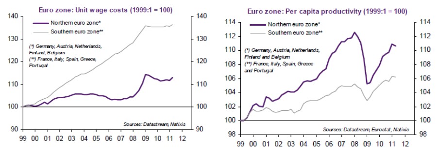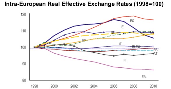 "Esto conllevó consecuencias desastrosas": en los últimos 10 años, la periferia europea experimentó un gran aumento en los salarios y precios en comparación con el núcleo de la zona euro, perdiendo así competitividad; como resultado, importaron mucho más de lo que exportaron, cayendo en grandes déficits por cuenta corriente.
