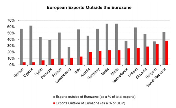 Por otro lado, la forma habitual por la que los países ganan competitividad es a través de una moneda más débil, pero los periféricos no pueden imprimir moneda, y devaluar el euro respecto a otras divisas tampoco ayudará a la periferia ya que "casi todas sus exportaciones" se dirigen a otros países de la zona euro. Grecia, España y Portugal exportan muy poco a países de fuera del euro. "A excepción de Irlanda, los PIIGS no son economías muy abiertas".