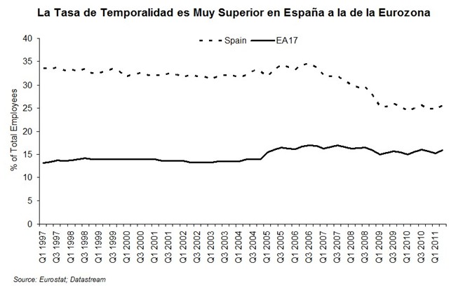 Es la famosa dualidad: un segmento de los trabajadores disfrutan de relativamente buenas condiciones y considerable protección, especialmente en términos de indemnización por despido y salarios (serían los insiders, los que están dentro); mientras que el resto carece de protección, sufriendo una elevada precariedad y temporalidad de los contratos (outsiders, los que están fuera).