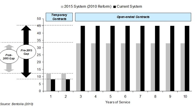 De esta forma, las indemnizaciones por despido crecerían de forma continuada con el tiempo, sin la gran ruptura que existe ahora cuando se pasa de contrato temporal a indefinido, que perjudica gravemente a los outsiders.