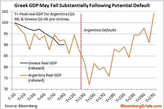 Acudiendo a estas experiencias históricas, las consecuencias para Grecia de una suspensión de pagos y devaluación de su moneda no serían tan desastrosas y apocalípticas. Siguiendo lo ocurrido en la crisis argentina, el PIB griego caería profundamente tras declararse en default como así lo hizo el argentino: