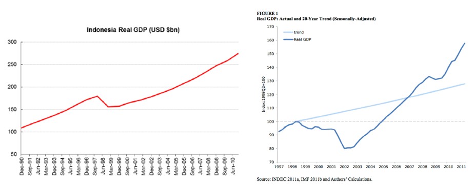 Sin embargo, llama la atención el hecho de que el tiempo de caída de las economías de estos países duró relativamente poco, alrededor de seis meses -en el caso ruso- o un año -en el caso de los países asiáticos y Argentina-. Después de este intenso pero breve declive, todas las economías experimentaron un crecimiento sostenido durante la siguiente década. (En los gráficos, el comportamiento del PIB en términos reales de Indonesia y Argentina.)