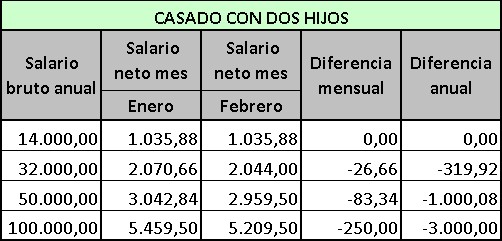 Como puede verse en el siguiente gráfico, un soltero sin hijos que gane 50.000 euros, pagará 1.000 euros más cada año (el palo en febrero será de unos 83 euros). Del mismo modo, una persona casada y con dos hijos, con unos ingresos de 100.000 euros pagará unos 3.000 euros más al año (con un recorte de la nómina de alrededor de 250 euros).