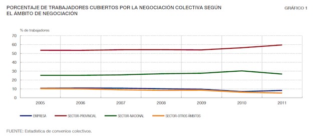 El trabajo de Jimeno y Thomas se inicia analizando la situación actual del mercado laboral español. A más del 50% de los trabajadores cubierto por negociación colectiva se les aplica el convenio provincial; mientras, menos del 10% están bajo el ámbito del convenio de empresa. En total, existen unos diez millones de trabajadores acogidos a cinco mil convenios de todo tipo (empresarial, sectorial, provincial, autonómico) que afectan a más de 1.400.000 empresas.