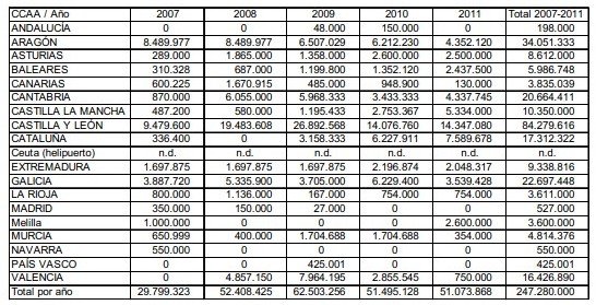 De los casi 30 millones de euros concedidos en 2007 se ha pasado a más del doble (62,5 M€) en 2009, año en el que alcanzaron su máximo histórico, descendiendo un 18% (hasta 51 millones de euros) en 2010 y una cifra similar en 2011. El total de fondos públicos concedidos a estas aerolíneas por medio de “contratos publicitarios” asciende a cerca de 250 millones de euros.