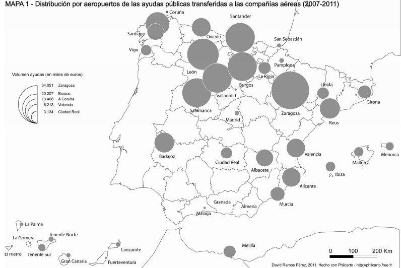 Por otra parte, el reparto de los fondos públicos entre las diferentes comunidades autónomas es muy irregular. Por regiones, el aeropuerto de Burgos es el que de media más fondos recibió entre 2007 y 2011, con más de 226 euros por pasajero, seguido del de Albacete, Salamanca, León, Badajoz, La Rioja y Valladolid.