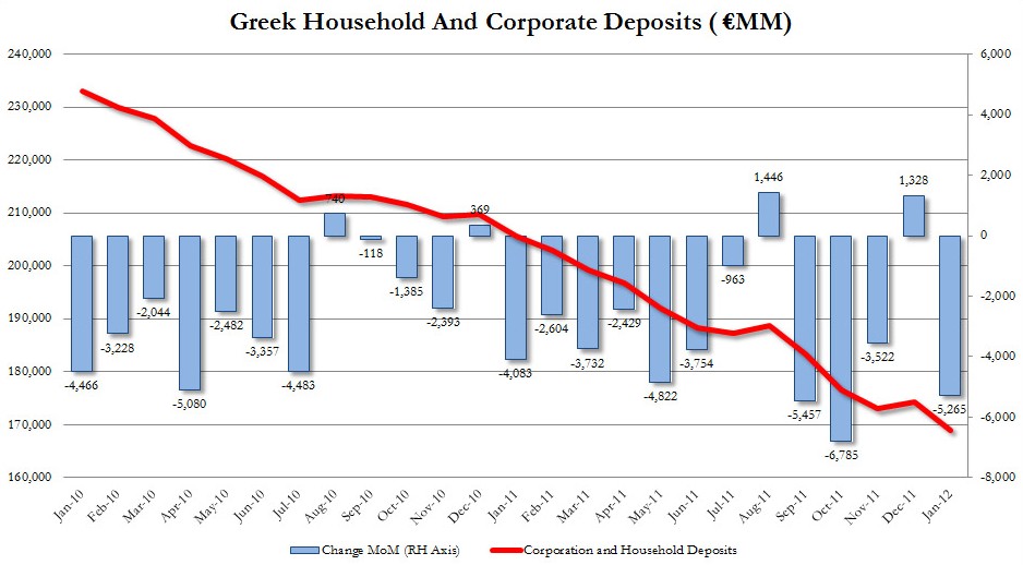 Sólo en 2011 los depósitos helenos cayeron un 18% (37.000 millones menos), y el pasado enero continuó esta tendencia. Según admitió el Gobierno heleno, parte de este dinero (alrededor de 16.000 millones) fue depositado en cuentas extranjeras. Más de un tercio de esta cuantía se refugió en Gran Bretaña, mientras que un 10% emigró a Suiza. El resto se supone que permanece en efectivo en manos de los griegos.