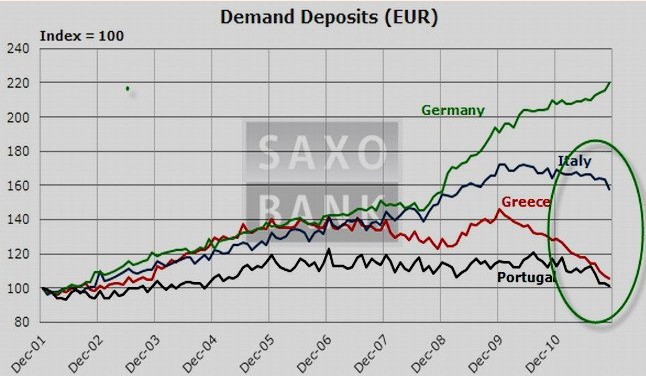 Los ahorradores desconfían de los periféricos y se refugian en el norte de Europa. La fuga de depósitos no es un fenómeno nuevo en la zona euro. La retirada de efectivo del sistema bancario comenzó en Grecia hace casi dos años, tras el estallido de la crisis de deuda pública en 2010. Desde entonces, el volumen de depósitos no ha dejado de descender en el país heleno. A partir de ese momento, la desconfianza se fue extendiendo de forma progresiva a Irlanda y Portugal, hasta el punto de empezar a afectar a España e Italia a lo largo de los últimos meses.
