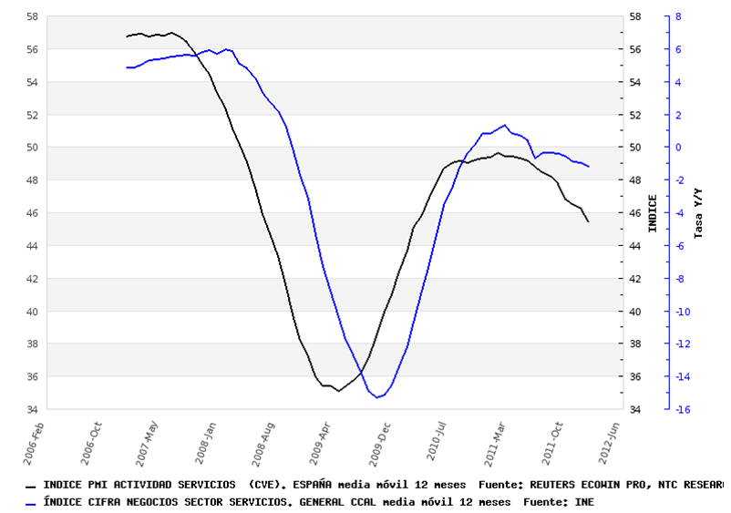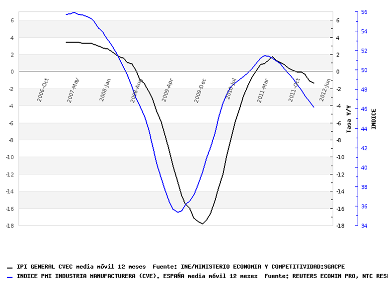 En el gráfico se representa el Índice de Producción Industrial (IPI) frente al PMI manufacturero para evitar la distorsión producida por la inflación que se da en la cifra de negocios y mostrar así la gran correlación que existe entre ambos indicadores.