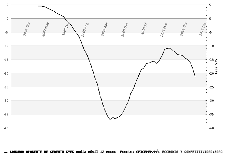 Para el tercer sector importante, la construcción, elegimos como indicador el consumo de cemento. Como se ve en el gráfico, la tasa de caída se está recrudeciendo y otra vez se halla por encima del 20%.