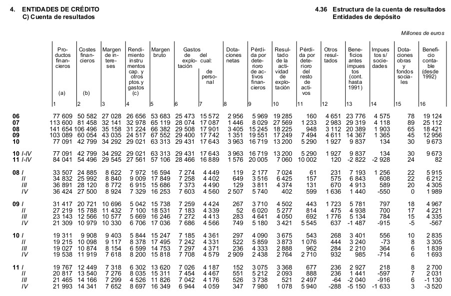 El conjunto del sistema financiero español cerró 2011 salvando los muebles in extremis, tras obtener unos pírricos beneficios contables de 82 millones de euros en el territorio nacional, según datos del Banco de España. Esta cifra contrasta con los 9.673 millones de beneficios obtenidos en 2010, lo cual supone un desplome del 99,1% en el último año, y se queda a años luz de los 25.112 millones logrados en 2007, justo antes de la crisis.