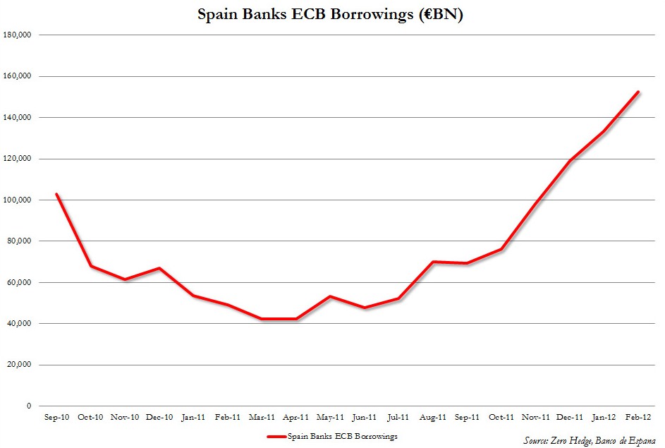 Mientras, por otro lado, las entidades españolas acapararon en febrero prácticamente la mitad del crédito concedido por el Banco Central Europeo (BCE), ante la sequía que atraviesa el mercado mayorista de financiación. En concreto, 152.400 millones de euros, el 47% del total de la deuda pendiente de devolver al BCE por los bancos del Eurosistema. Un dinero que está siendo empleado para comprar deuda pública española y financiar vencimientos.