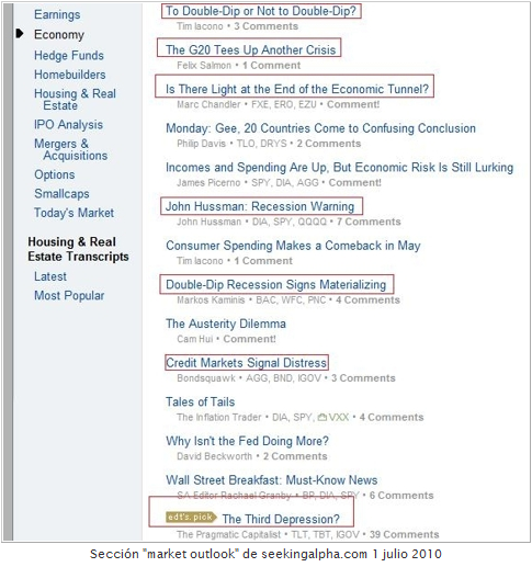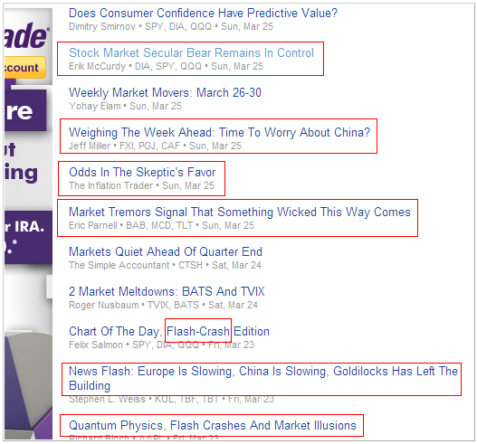Una de mis formas favoritas de entender cuál es la percepción de los observadores del mercado es analizar el tono general de las opiniones bursátiles. En el portal Seeking Alpha, el tono era bastante negro el domingo. La gente habla de "mercados seculares bajistas", la preocupación por la economía de China, "señales de peligro", los problemas de Europa o, curiosamente, siguen hablando del "flash crash" que fue algo que ocurrió hace dos años y cuyo impacto fue limitado. El tono a todas luces es evidentemente pesimista: