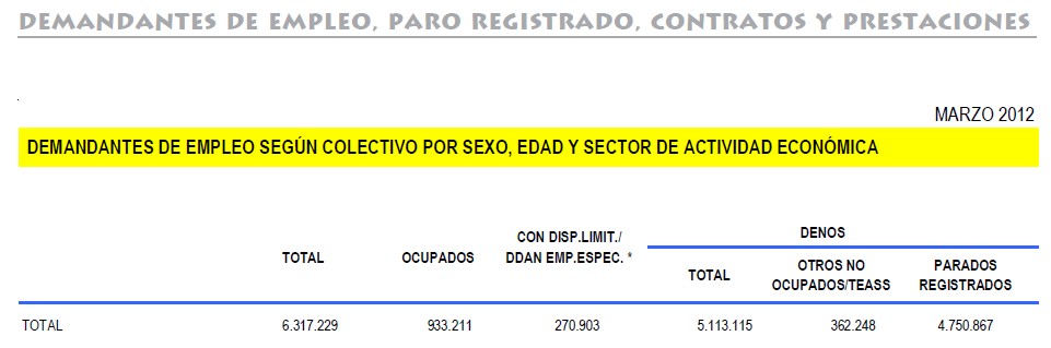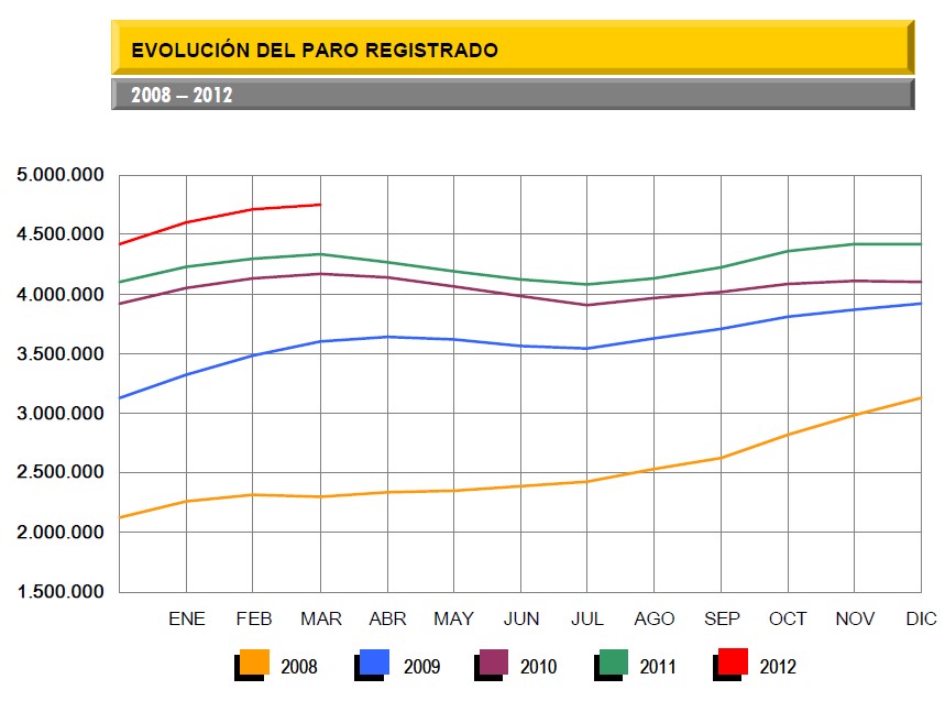 Según los datos oficiales publicados por el Ministerio de Empleo, el número de parados registrados en las oficinas de los servicios públicos de empleo (antiguo INEM) se situó al finalizar marzo en más de 4.750.867 millones de personas, tras subir en el mes en 38.769 desempleados, con un aumento porcentual del 0,82% respecto a febrero, informó este martes el Ministerio de Empleo y Seguridad Social.