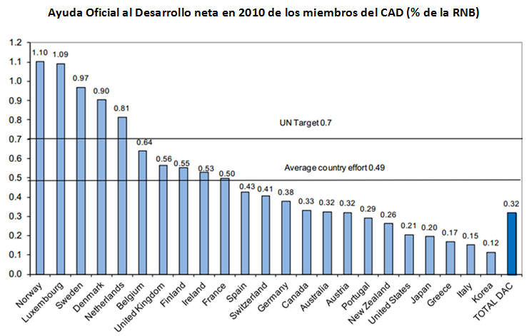 De entre los países miembros del CAD, son los nórdicos quienes mayor cantidad de AOD destinan respecto a su nivel de renta, mientras que Corea, Grecia e Italia se sitúan en la cola, con Estados Unidos y Japón detrás. La imagen cambia si se consideran los flujos absolutos, dado el pequeño tamaño de las economías nórdicas, por un lado, y el enorme volumen de EEUU o Japón.