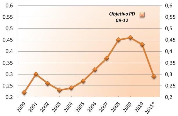 En 2011, la previsión es alcanzar el 0,4% de la RNB, con un volumen total de 4.233,71 millones de euros de AOD neta. La meta del 0,7% no se alcanzará, por tanto, en 2012 como establecía el Plan Director. Se reafirma, no obstante, el objetivo de alcanzarlo en 2015 y el mensaje de que el desarrollo, y su efecto deseado -la erradicación de la pobreza-, sigue siendo un compromiso político fundamental.