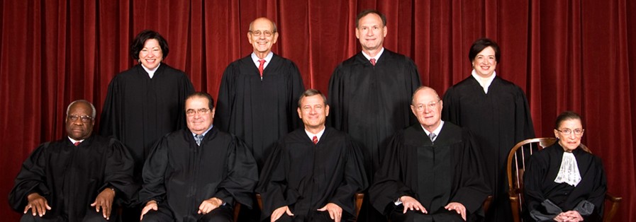 Los jueces del Tribunal Supremo de EEUU. Detrás de pie, de izquierda a derecha: Sonia Sotomayor, Stephen Breyer, Samuel Alito y Elena Kagan. Sentados, de izquierda a derecha: Clarence Thomas, Antonin Scalia, John Roberts, Anthony Kennedy y Ruth Bader Ginsburg.