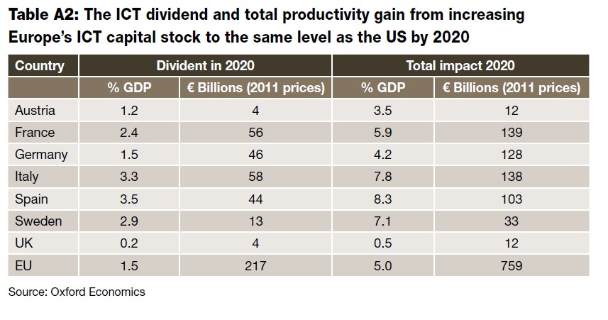 Como en muchas otras cuestiones, esta cruz tiene también su cara. El potencial de mejora de las compañías españolas es mucho más elevado que el de sus competidores. De hecho, según el estudio Capturing the ICT Dividend, de AT&A y Oxford Economics, la economía europea podría crecer hasta un 5% de aquí a 2020 gracias sólo a las mejoras de productividad derivadas de la mayor inversión en tecnologías de la información y la comunicación (TIC o ICT en inglés). Esto supondría una ganancia de 760.000 millones de euros para el conjunto de la UE o 1.500 euros por habitante.