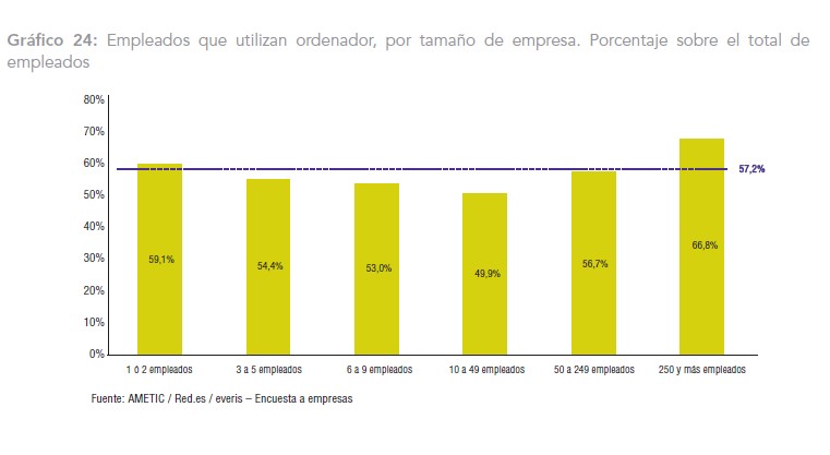 Sin embargo, esto debería empezar a cambiar poco a poco. El porcentaje de empleados que utiliza un ordenador es creciente. Y cuando casi todos los trabajadores de una empresa o departamento usa programas informáticos es mucho más probable que sea rentable para la compañía empezar a implementar aplicaciones que hasta ese momento no tenía en mente. Como puede verse en el siguiente gráfico, en todos los niveles (tanto pymes como grandes corporaciones), al menos un 50% de los trabajadores maneja habitualmente algún tipo de herramienta informática en su trabajo.