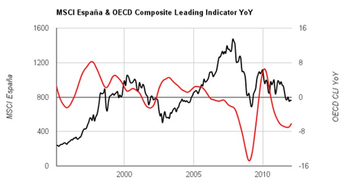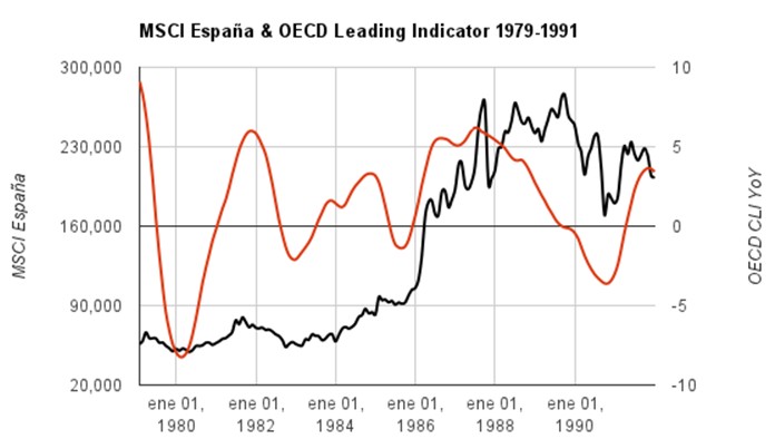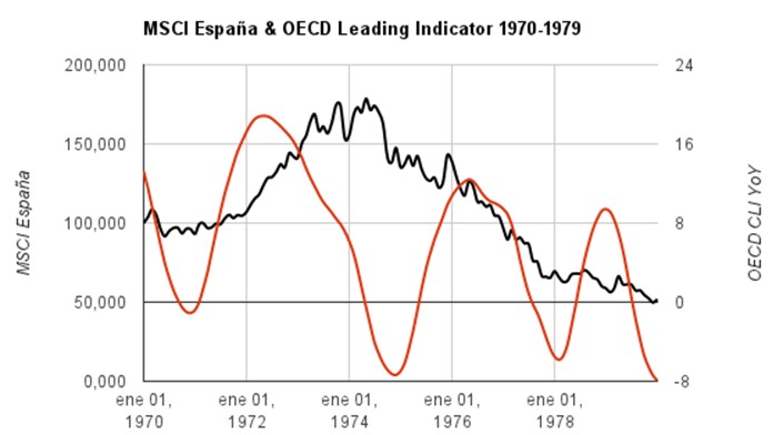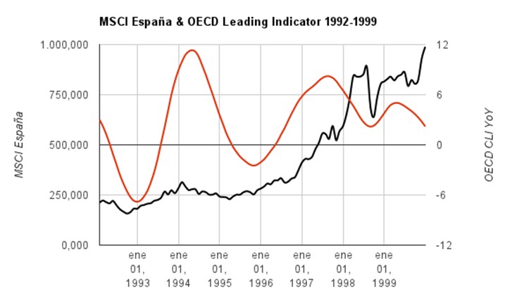 Para resumir, vamos a utilizar un indicador líder agregado como es el OECD Leading Indicator (tasa de cambio interanual) y lo vamos a comparar con el índice bursátil MSCI España: