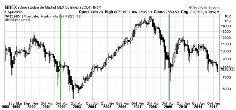 Aquí tenemos el gráfico mensual en velas Heiken Ashi del IBEX 35, el selectivo español. Las dos líneas verticales verdes corresponden a los puntos de giro al alza de nuestro indicador líder. En noviembre de 2001 el indicador dio señal y, sin embargo, la bolsa, después de unos meses en lateral, se desplomaría durante el año 2002 para, finalmente, encontrar suelo.