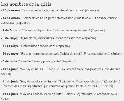 La actual crisis económica ha originado nuevos términos y redefiniciones en boca de los políticos para tratar de ocultar la realidad a la opinión pública. El caso más llamativo fue el protagonizado por el expresidente del Gobierno José Luis Rodríguez Zapatero que, durante meses, insistió en negar la crisis haciendo acopio de términos de todo tipo, tales como "desaceleración transitoria ahora más intensa", para evitar pronunciar la palabra maldita: "crisis".