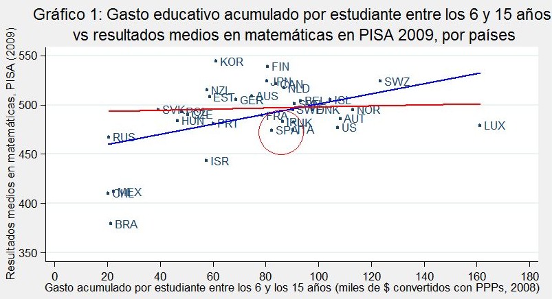 La conclusión que se saca es que un nivel mínimo de gasto es imprescindible. Evidentemente, es muy difícil dar una educación de calidad con 200 euros al año por alumno. Pero una vez alcanzado ese mínimo (algo que todos los países europeos han conseguido), los incrementos del presupuesto no tienen por qué ser buenos. Lo importante sería dónde poner el dinero y no el gasto total.