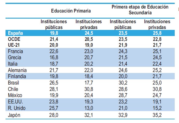 Cuando se habla del gasto en educación, una variable que se maneja habitualmente es la de alumnos por clase y por profesor. También aquí España presenta cifras similares a las de los países de la UE. En los colegios públicos de primaria, por ejemplo, el número de niños por clase es de 19,8, frente al 21,7 de Alemania o los 28 de Japón (uno de los grandes triunfadores de PISA). Y en los institutos, la cifra de 23,5 es también inferior a la de estos dos países (24,6 para el europeo y 32,9 para el asiático).