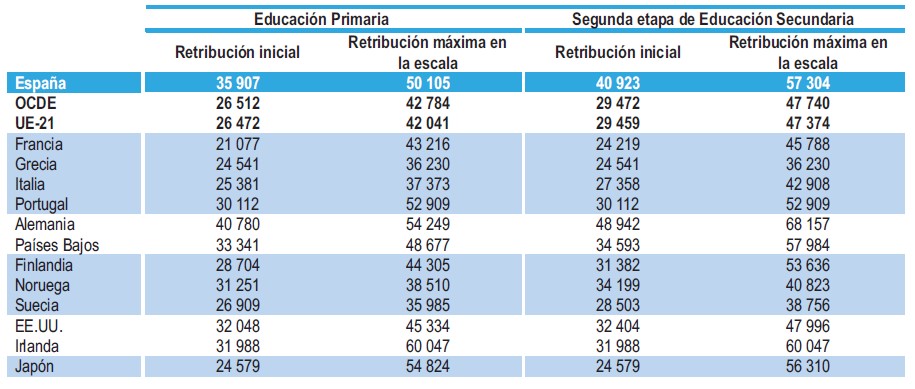 - La paga inicial para un profesor de secundaria es de 40.923 euros (en miles de euros convertidos mediante paridad del poder adquisitivo; es decir, ajustando en función del PIB per cápita de cada país). Mientras, la media de la OCDE es de 29.472 euros (en Finlandia, por ejemplo, este sueldo es de 31.382 euros).